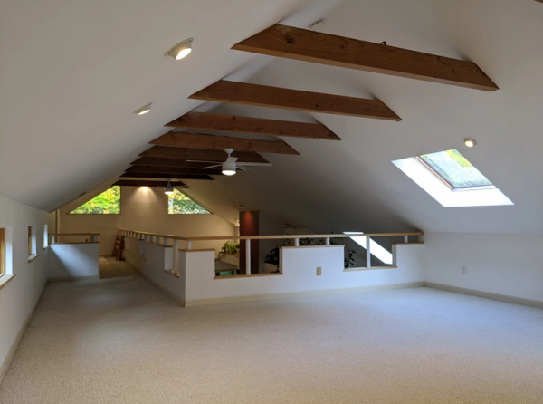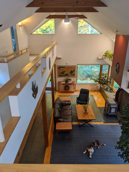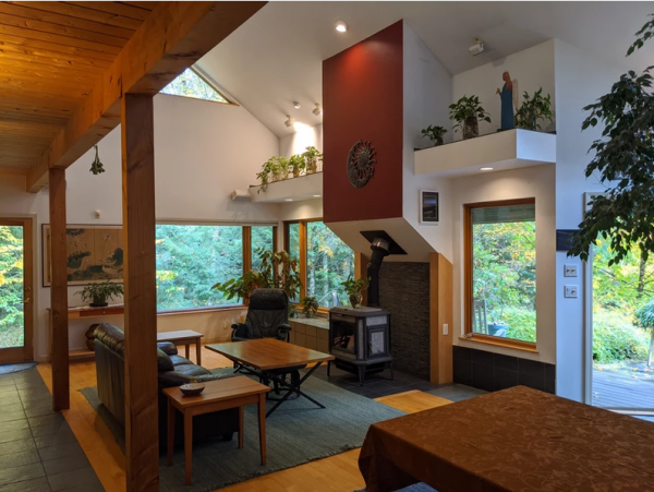 This is a 5 bedroom, 3 bath home on 10.01 acres. It is versatile and handsome, with expansive windows that merge the indoors with the peaceful outdoors. The original home was built in 1985 with exposed local spruce beams in a warm cottage style and has about 1200 sq. ft. The rest of the house was added in 1992 and is an architecturally designed open contemporary space of approx. 3200 sq. ft. with cathedral ceilings and lofts warmed by many skylights. The two areas open to each other through wide French doors.