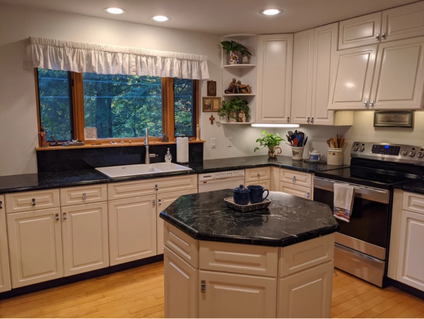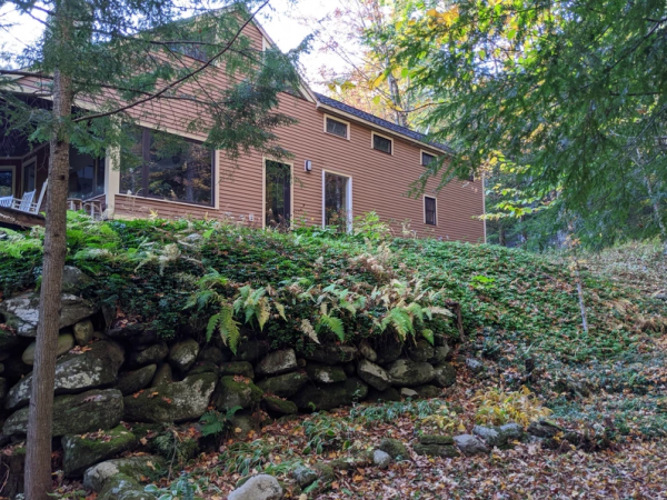 In the contemporary addition, the Mill Brook enhances southern views with soothing sounds when windows and doors are open. Choose radiant heating in zones to warm up, or use the 700 lb. soapstone wood stove, which is a center of gravity for family activities and entertainment of friends, as is the spacious marble-countered kitchen. The new master bathroom has a large shower and cherry dual sink vanity, which nicely complements the open, lofted, south-facing master bedroom. A walk-in closet keeps the master bedroom free of distractions from the beauty of the stream and woods visible outside.