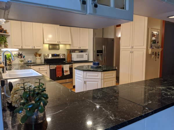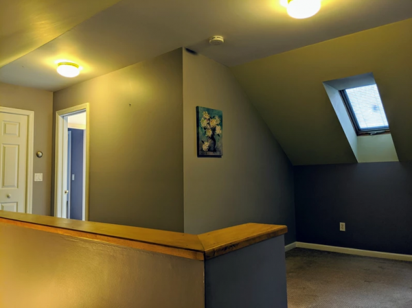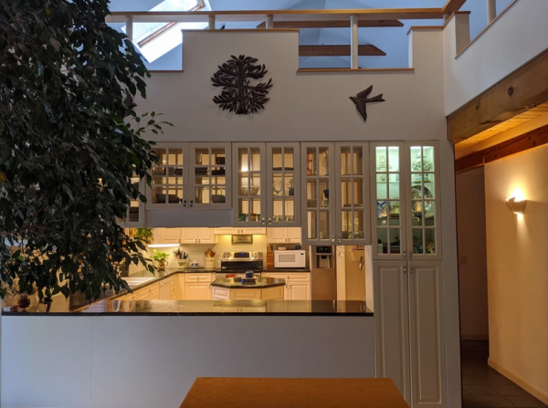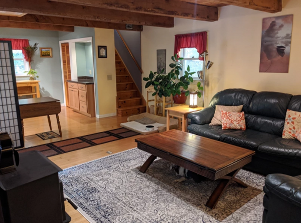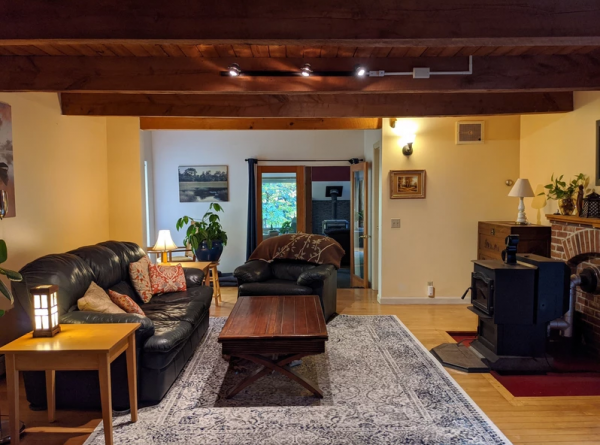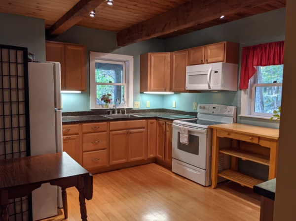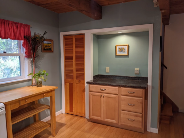 French doors open wide between the spacious living room and the family room in the original building. This part of the house includes a modern kitchen and family room on first floor and upstairs are bedroom, office and 3/4 bath. It's a warm and cozy space, and growing up our kids loved it the best! Additional features include an efficient pellet stove in the family room, zoned baseboards which provide an additional heating option, and a walk-in closet in one of the upstairs rooms.