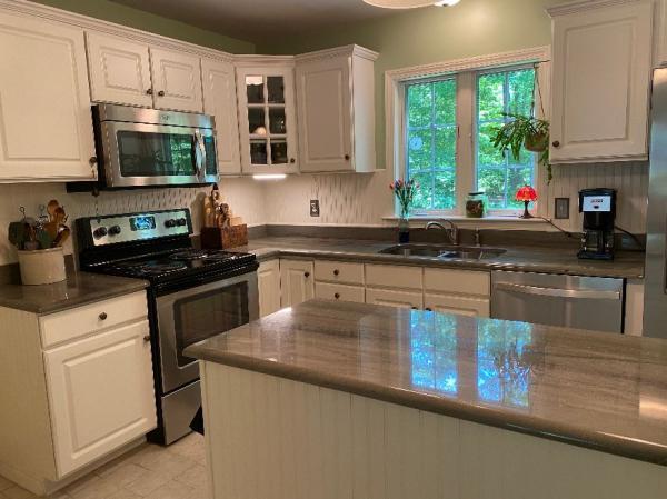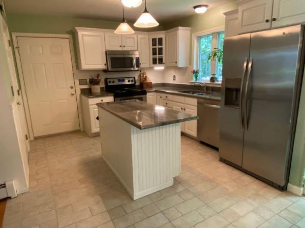 Natural gas, hot-water baseboard heat with two zone thermostats. All appliances included in sale: stainless steel refrigerator, electric stove, microwave and dishwasher, plus washing machine and electric dryer.
